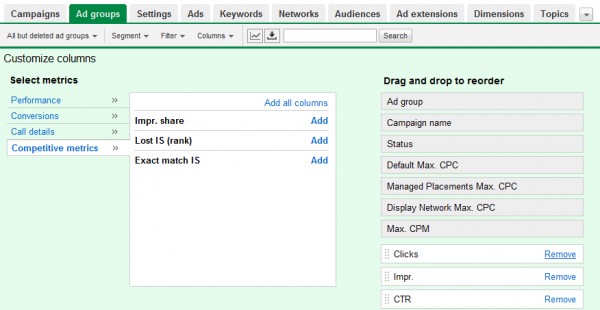 Gösterim Payı raporları "mevcut gösterimler çoğunluğu yakalamak değil yüksek performanslı reklam gruplarını tanımlamak" veri ile onlara yardım etmek için reklamverenler sağlamak için reklam grubu düzeyinde geliyor raporları Google duyurdu Sadece Google reklam grubu düzeyinde Gösterim payı verileri getiriyor ama bu verilerle geliyor algoritmalar güncelliyoruz.Gelecek hafta, muhtemelen erken Şubat, Google dedi reklam grup raporlarında kullanılabilir üç yeni bir sütun göreceksiniz. Bunlar aşağıdakileri içerir: